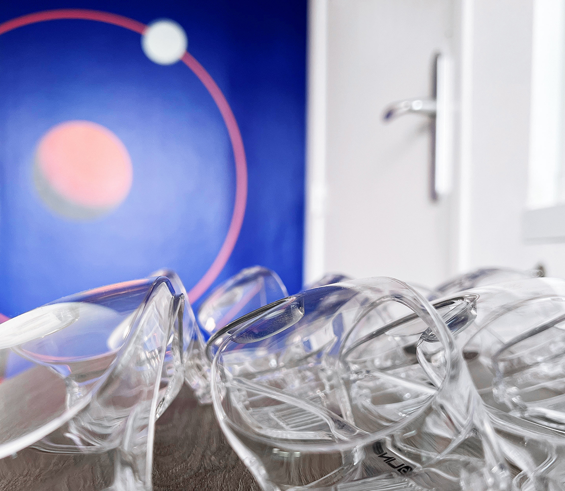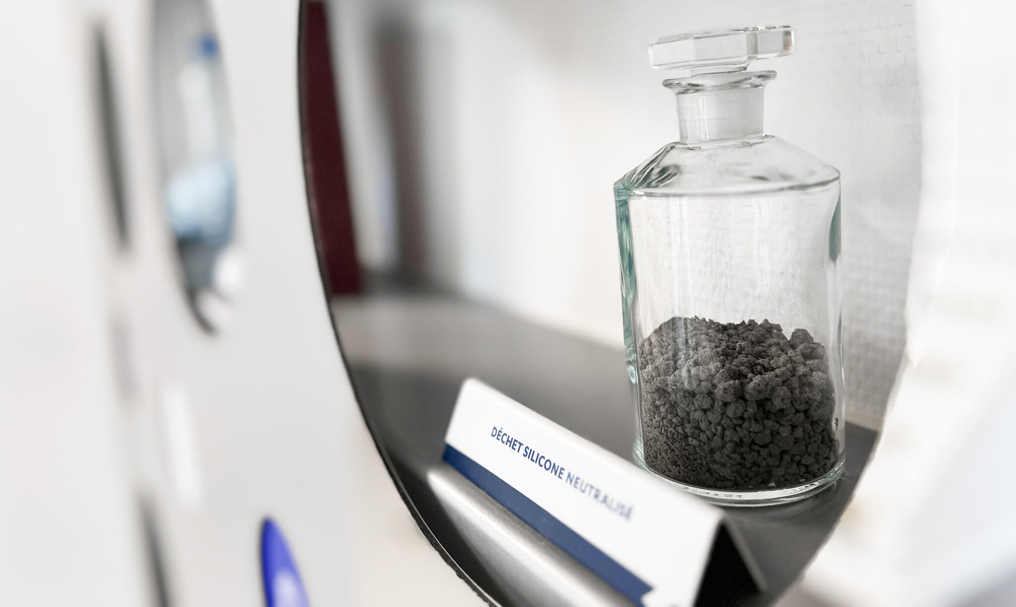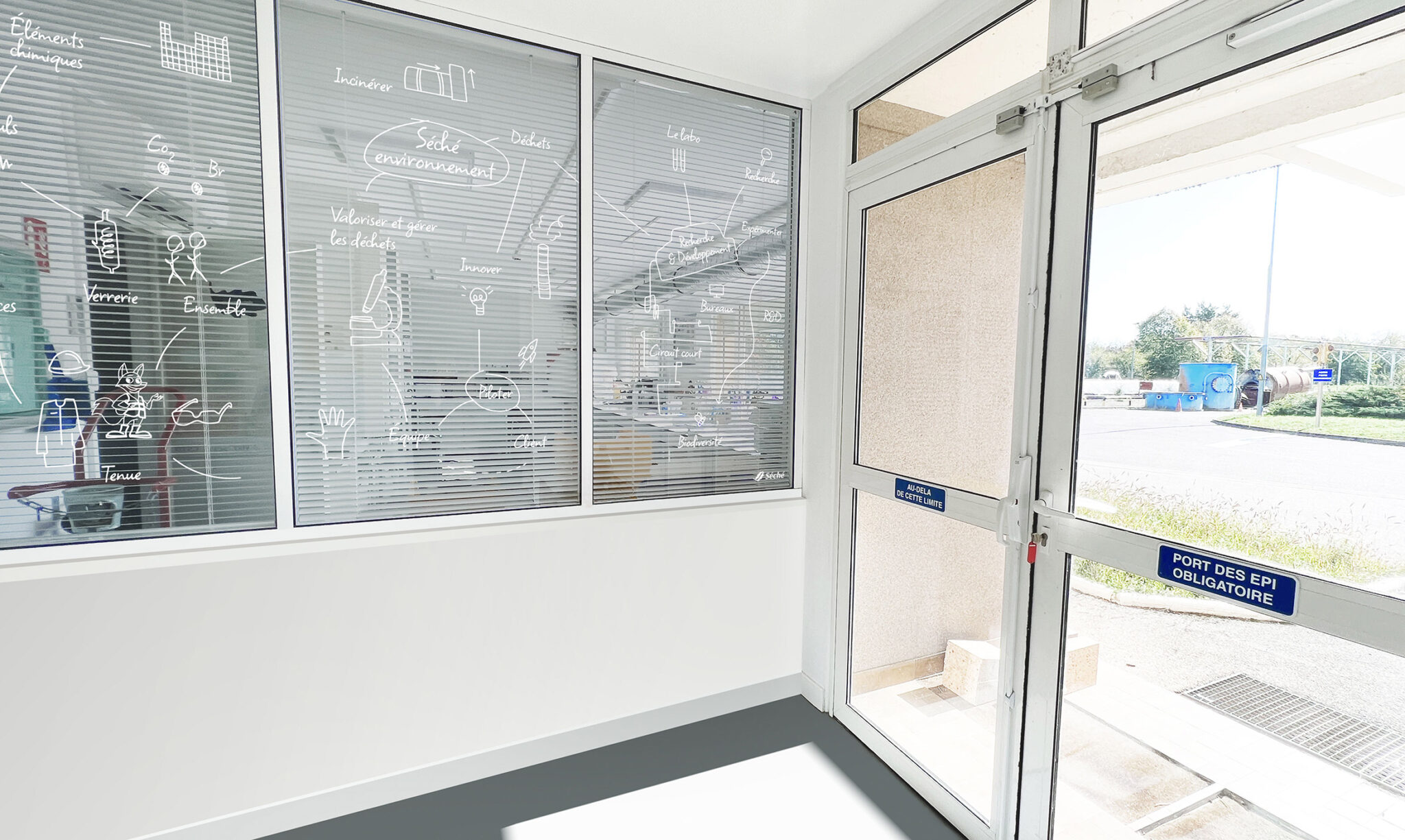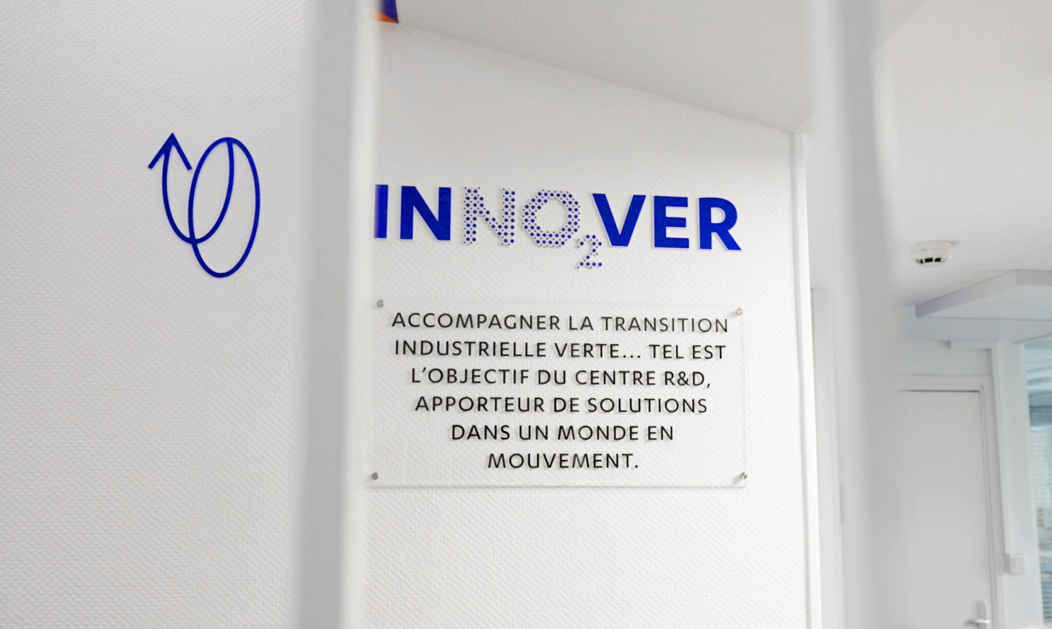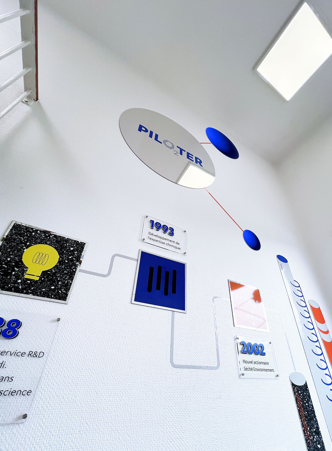 Après une immersion au cœur des équipes pluridisciplinaires du bâtiment R&D (scientifiques, universitaires, ingénieurs…), nous imaginons la visite comme un mouvement permanent entre l’infiniment petit (l’atome, la chimie) et l’infiniment grand (l’impact planétaire). À l’image du process technique du centre, le parcours se construit comme une expérience de séquences à explorer. Chaque espace devient un lien entre recherche et transmission, entre expertise et pédagogie. Nous intervenons sur l’identité globale, tout en investissant des lieux qui sont à la fois espaces de travail et parcours visiteurs : création du logotype pour l’entrée, design des étagères dédiées aux échantillons, signalétique immersive des couloirs, habillage graphique de l’espace pédagogique, vitrophanie du laboratoire, fresque historique monumentale dans la montée d’escalier.