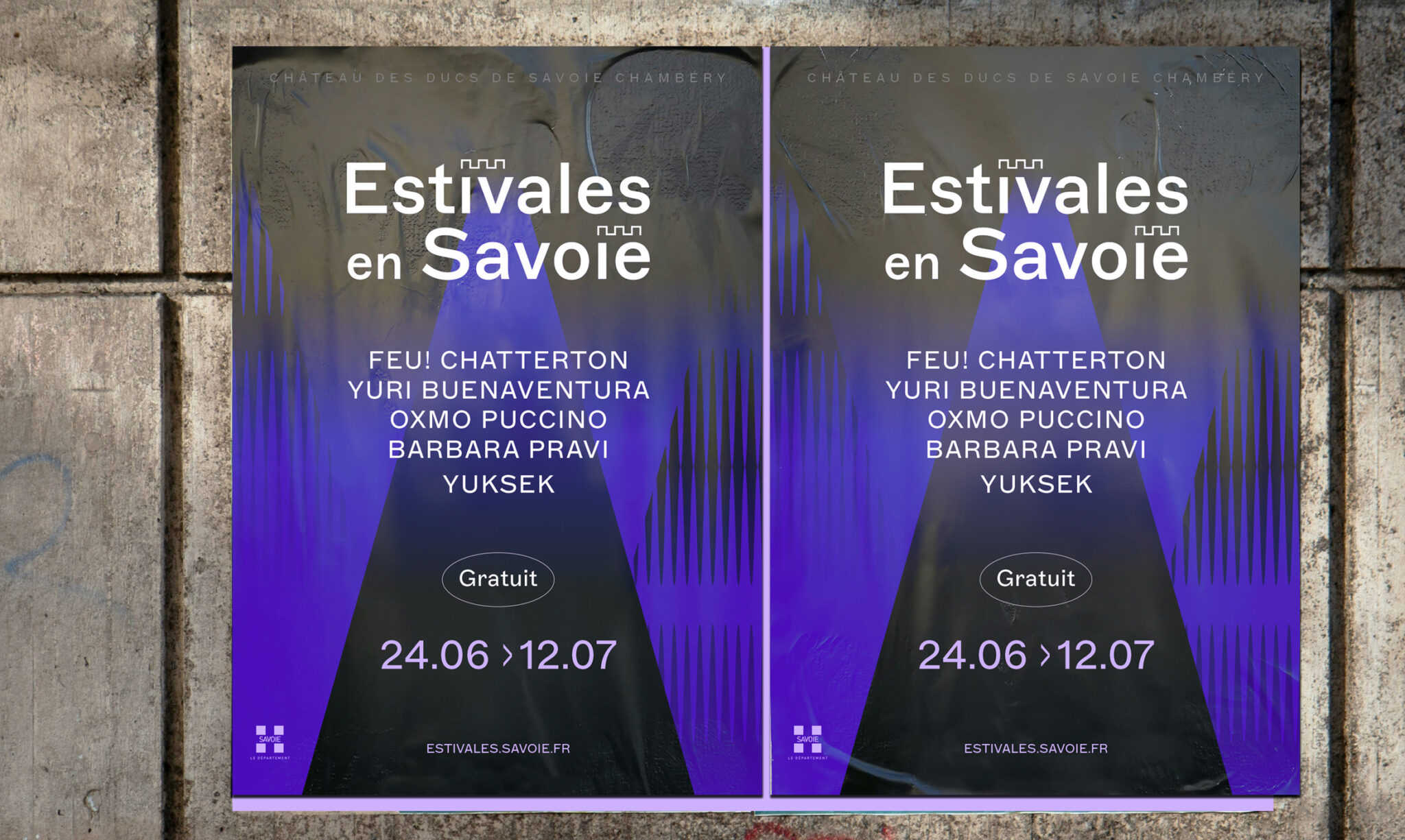 Chaque été, la cour d’honneur du Château des ducs de Savoie devient une scène à ciel ouvert où concerts et spectacles vivants se succèdent. Un rendez-vous gratuit porté par le Département de la Savoie, mêlant artistes de renommée internationale et nouvelles découvertes dans la douceur des premières soirées d’été. Pour les 20 ans du festival, nous avons repensé l’identité visuelle avec un double objectif : renforcer la notoriété de la marque Estivales en Savoie et concevoir un système graphique plus flexible, capable d’accompagner les éditions des prochaines années.