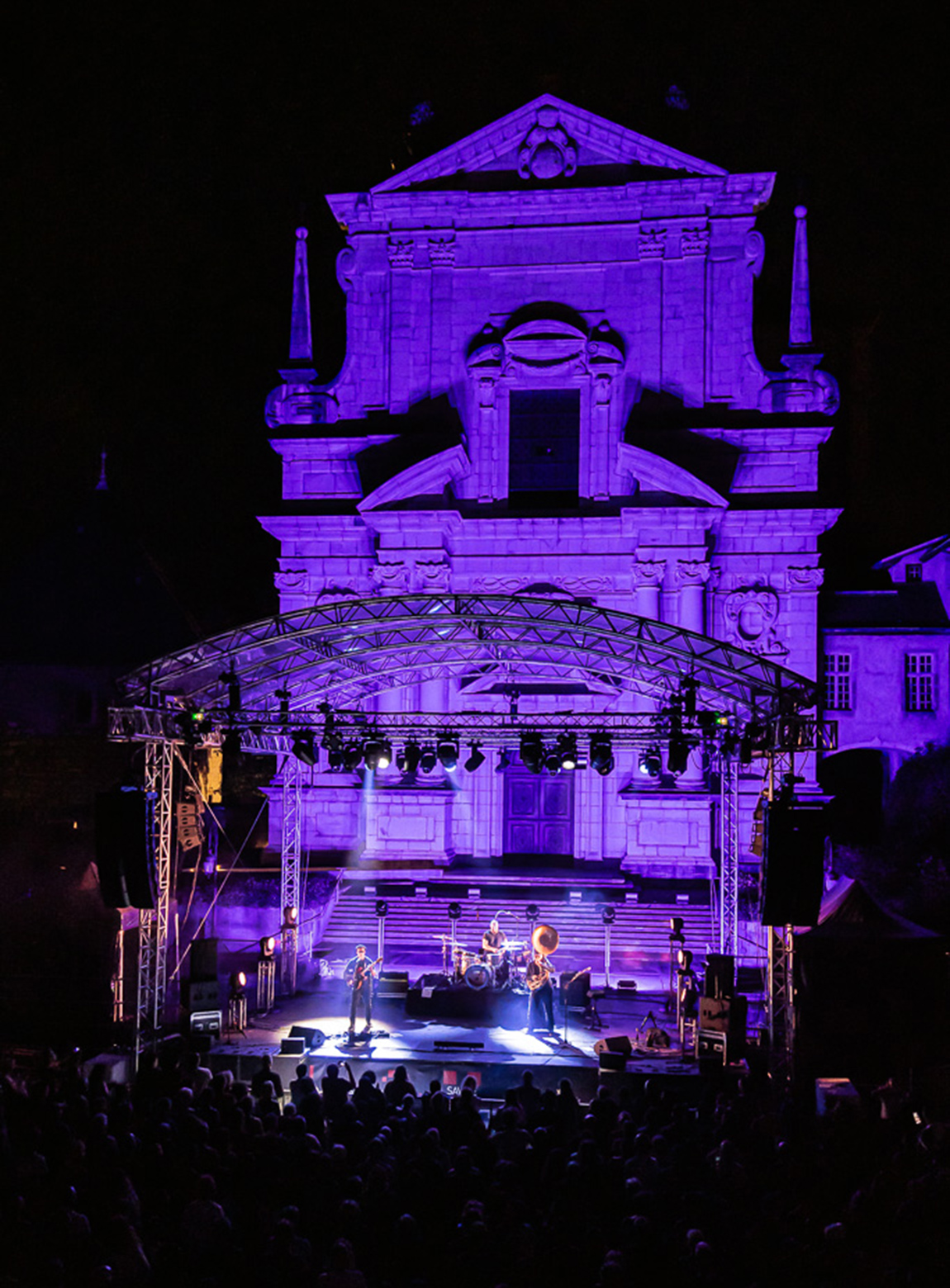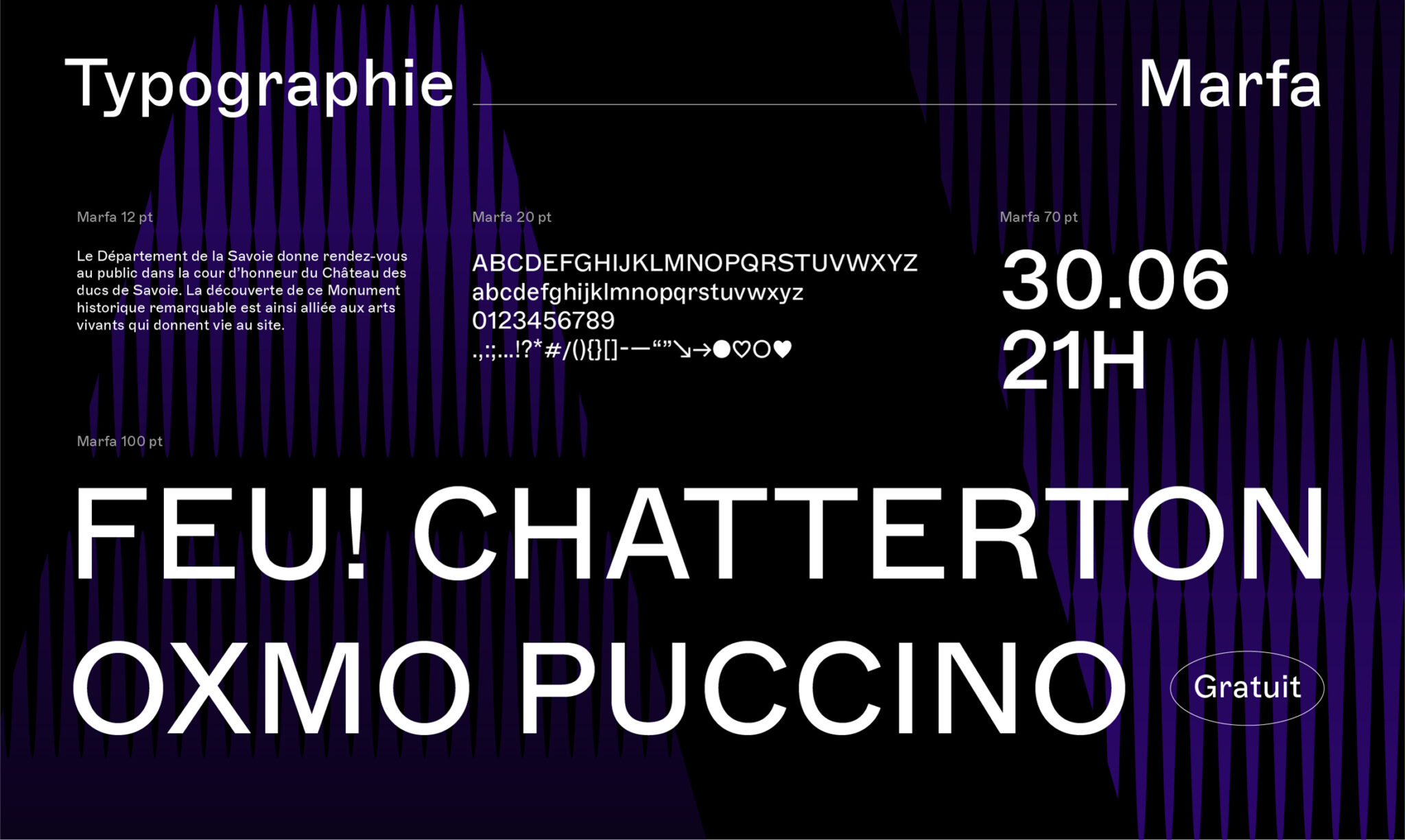 Au cœur du dispositif, un bloc-marque central, pensé comme un repère fort. Il doit s’adapter à une diversité d’univers graphiques et se déployer sur l’ensemble des supports de communication : site internet, affiches, insertions publicitaires, programmes, bâches, badges ou encore tee-shirts. Inspiré par l’architecture du lieu, le logotype intègre une stylisation du crénelage visible sur la tour du château et sur la corniche de la Sainte-Chapelle, toile de fond de la scène. Ce motif devient un marqueur graphique fort, reliant l’événement à son site emblématique. Au-delà de la référence architecturale, ce crénelage évoque également les carrés de la croix de Savoie, qui compose le logo du Département. Un icotype en forme de lien, une union forte entre la culture et le public.